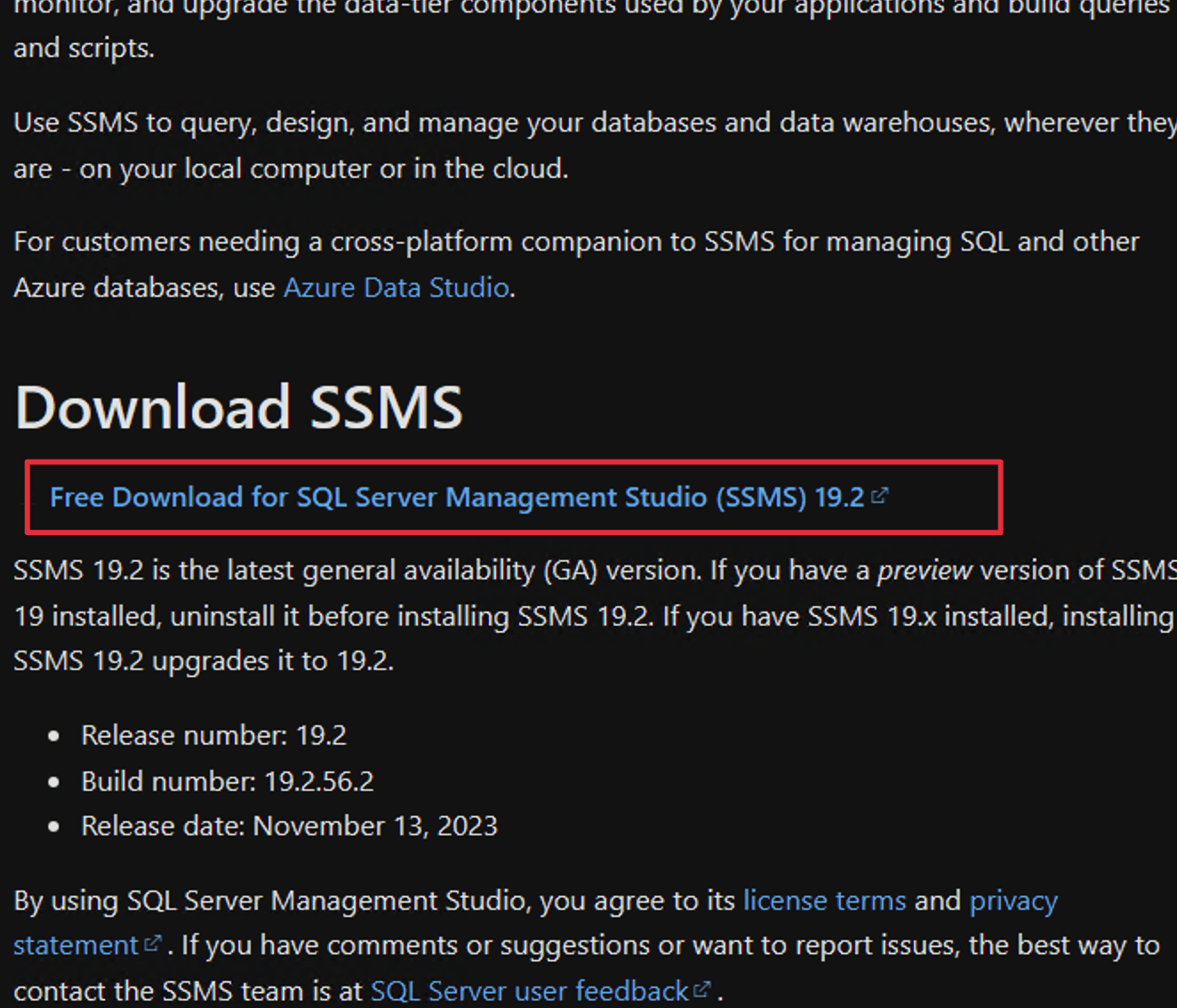 Tìm và bấm vào dòng Free Download for SQL Server Management Studio (SSMS) 19.2 để tải về .