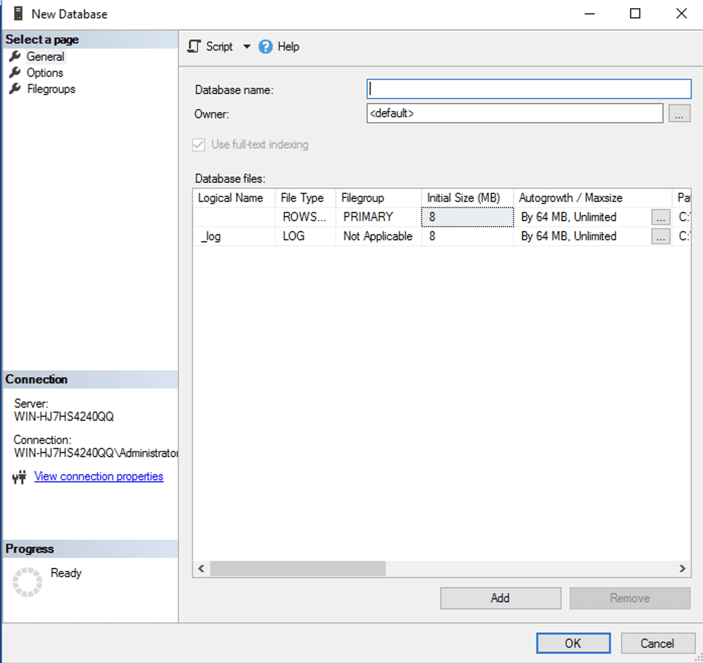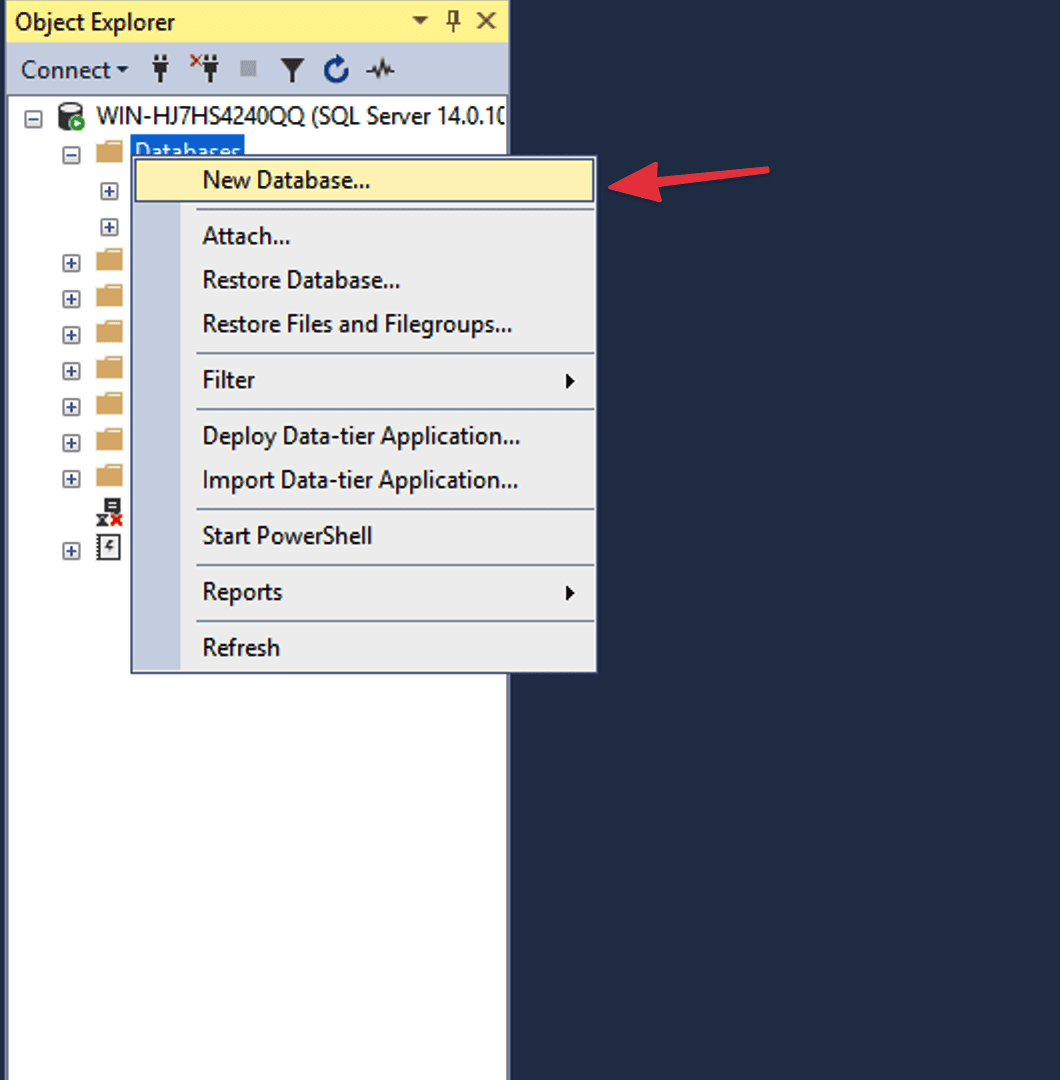 Sau khi kết nối thành công, tạo và sử dụng Microsoft SQL Server 2017 với thao tác cơ bản đầu tiên là Tạo mới Database (New Database).