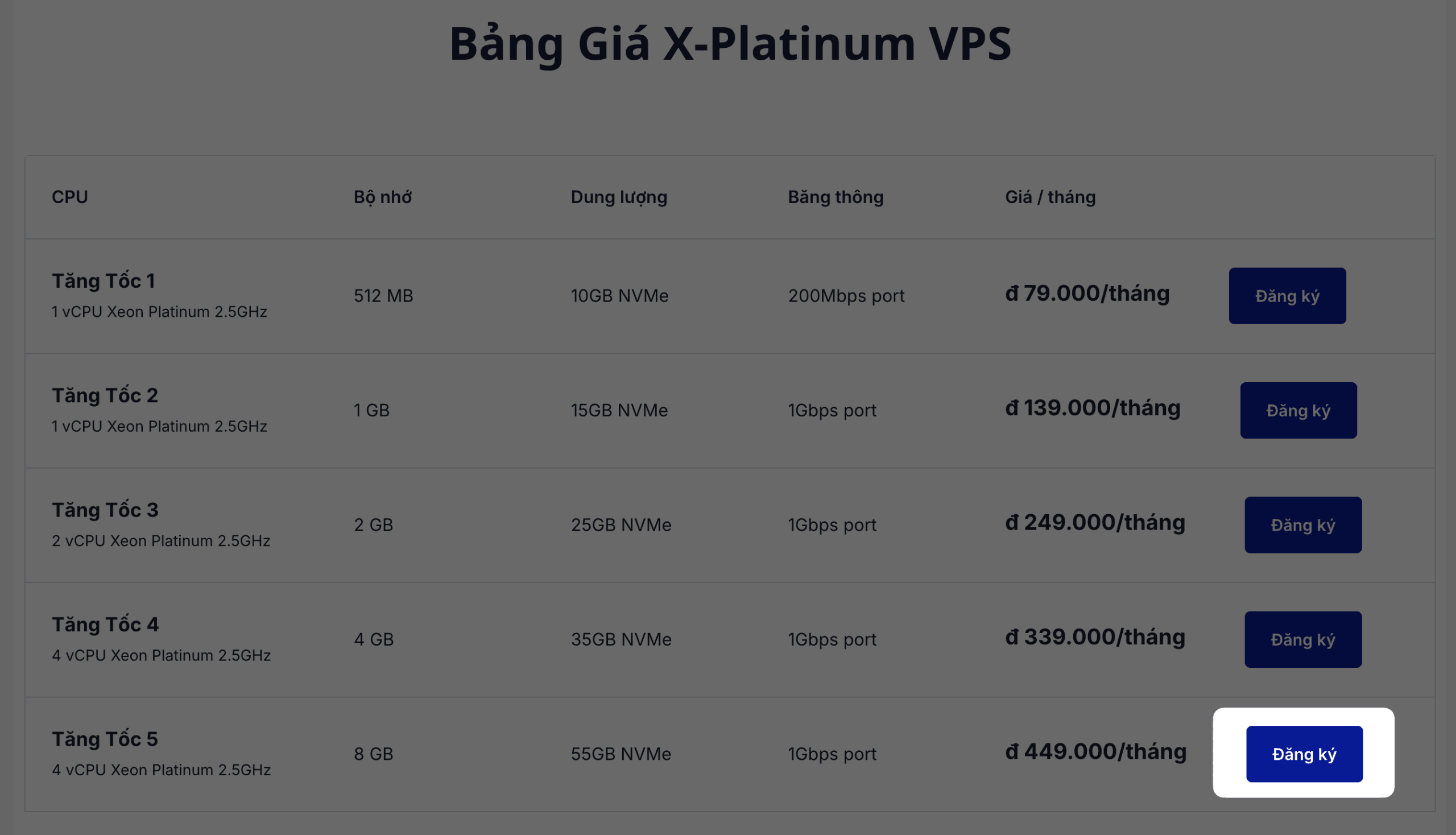 Nếu bạn lựa chọn AZDIGI, bạn có thể bắt đầu với gói X-Platinum VPS và chọn nút đăng ký ở gói Tăng Tốc 5 trên bảng giá thuê VPS.