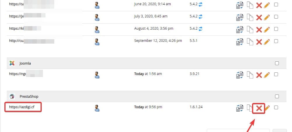 Tại giao diện Softaculous, bạn sẽ nhìn thấy tất cả các website đã được cài đặt thông qua Softaculous trước đó, bạn tìm đến website cần xoá và bấm vào dấu X tương ứng như hình.