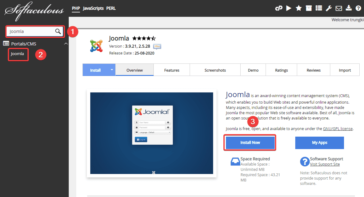 Tại giao diện Softaculous, bạn search Joomla lên ô tìm kiếm (1) => Joomla (2) => và nhấn Install Now (3) để thực hiện cài đặt.