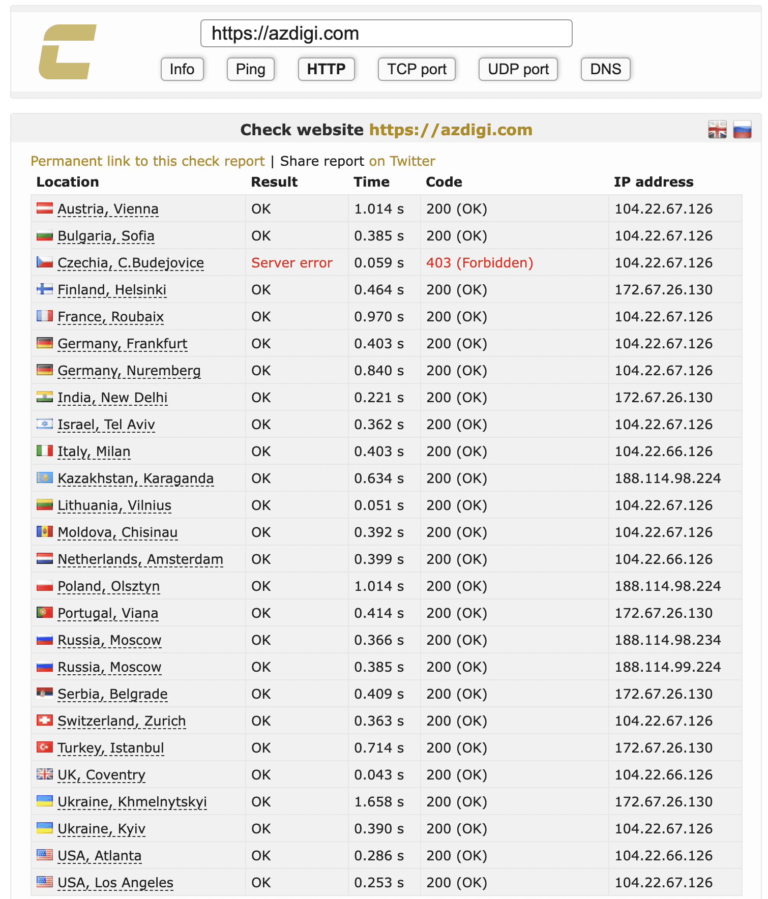 Kiểm tra mã HTTP website từ nhiều quốc gia