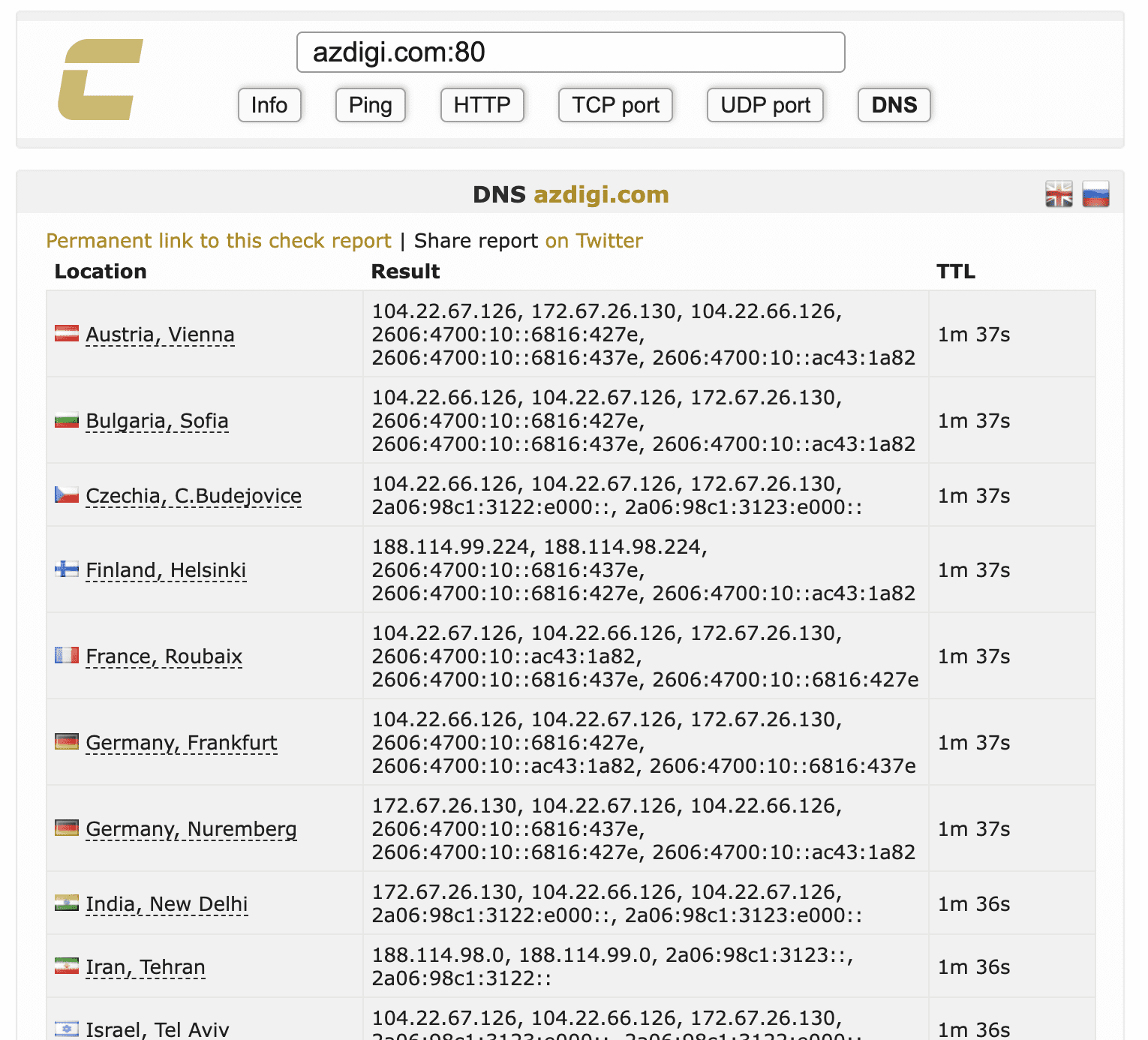 Để kiểm tra thông tin website, bạn nhấn nút Info tại trình đơn của website và nhập tên miền cần tra cứu (ví dụ azdigi.com). Lúc này, bạn sẽ thấy thông tin của địa chỉ IP máy chủ website sẽ trả về, lưu ý là thông tin này sẽ dựa theo địa chỉ IP mà website phân giải ra, có thể sẽ khác nếu bạn sử dụng dịch vụ nameserver từ CloudFlare.