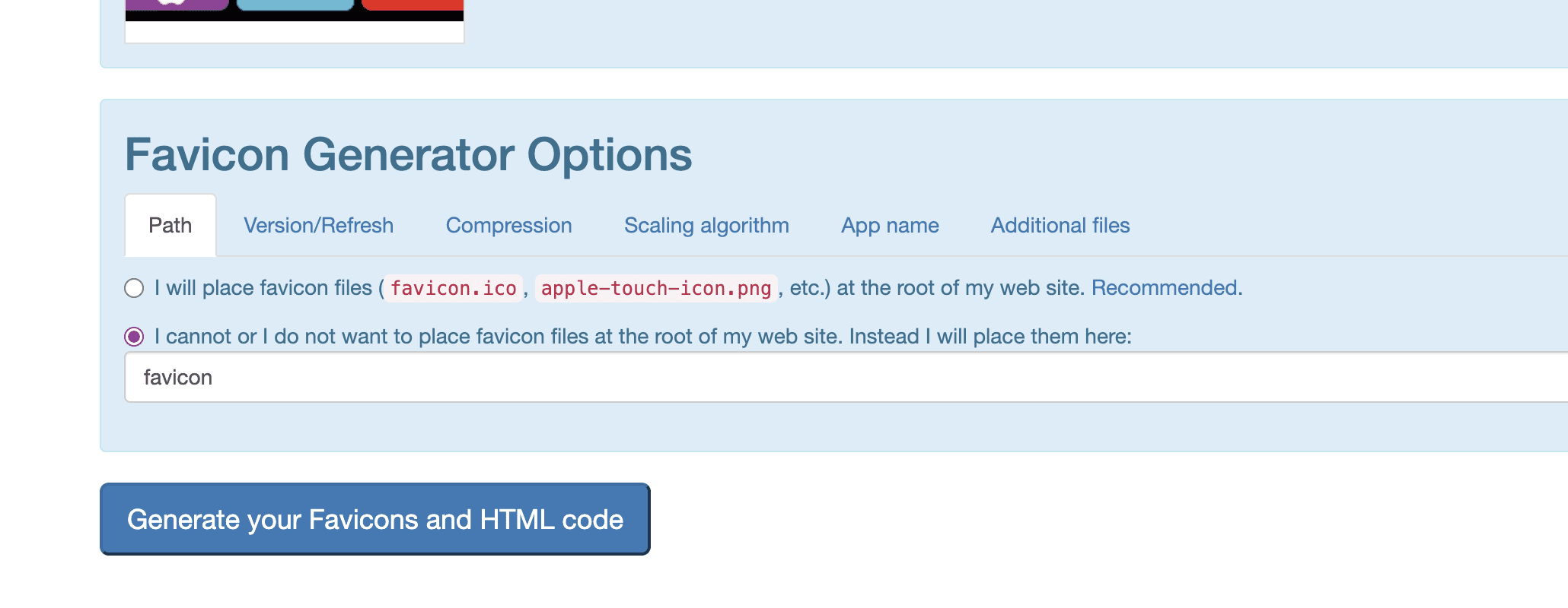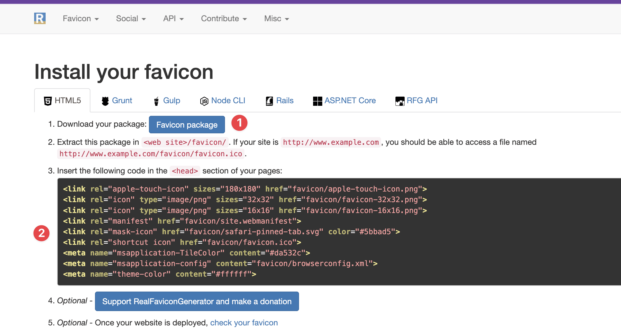 Sau đó bạn chọn Generate your Favicons and HTML code để lấy code html chèn vào header của theme.