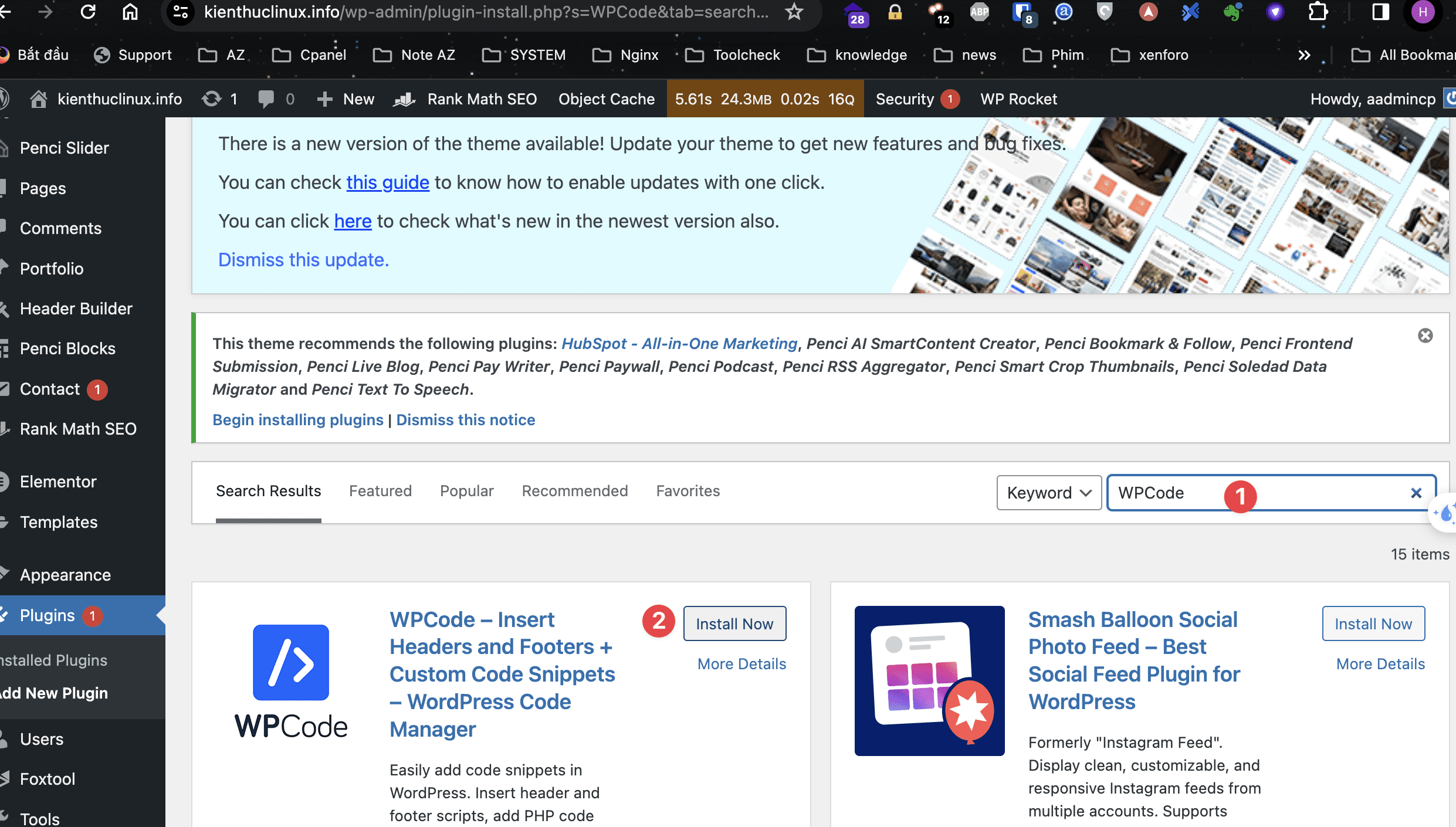 Bạn vào phần cài đặt plugin tìm kiếm (1)WPCode, rồi cài đặt(2).