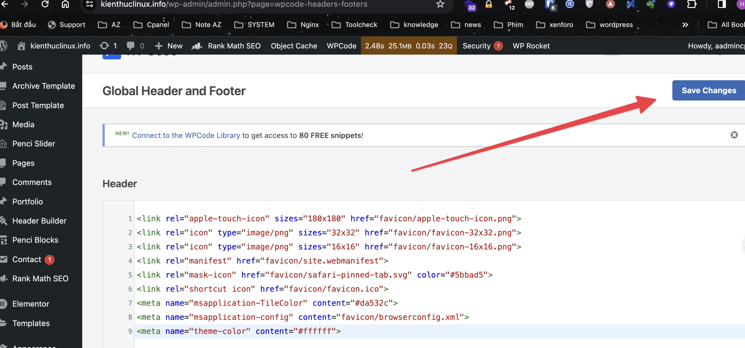 Thực hiện dán code vào và chọn Save Changes