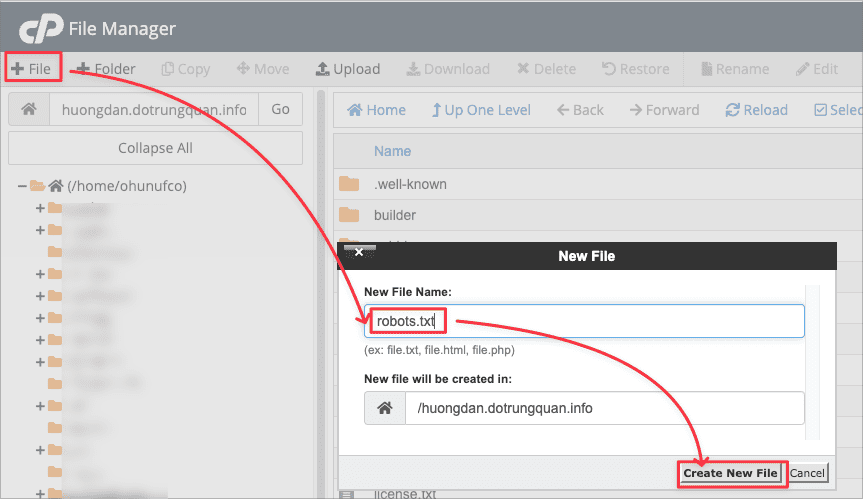 Cách thức tạo rất đơn giản, bên trong host hoặc VPS. Bạn di chuyển vào vị trí chứa mã nguồn vào tạo mới một file và đặt tên là robots.txt