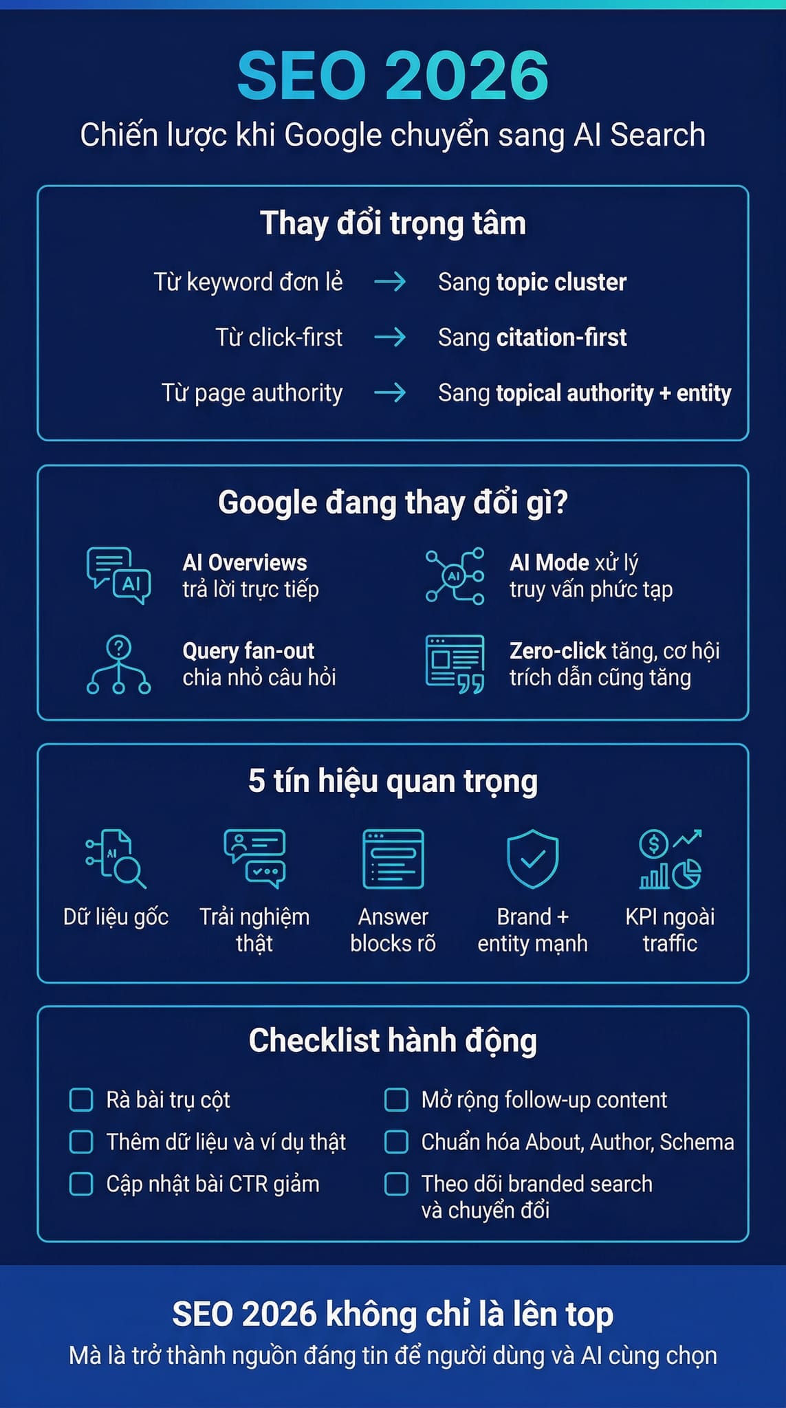 Làm SEO 2026 mà vẫn giữ cách chia việc cũ thì rất dễ hụt hơi. Thay đổi bây giờ nằm ở ít nhất bốn lớp.