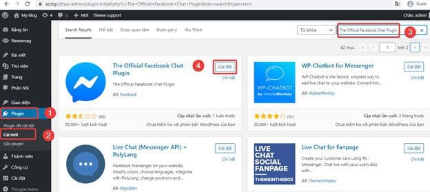 Tại giao diện quản trị bạn truy cập: Plugin (1) => Cài mới (2) => Search Plugin The Official Facebook Chat Plugin (3) => Cài đặt (4).