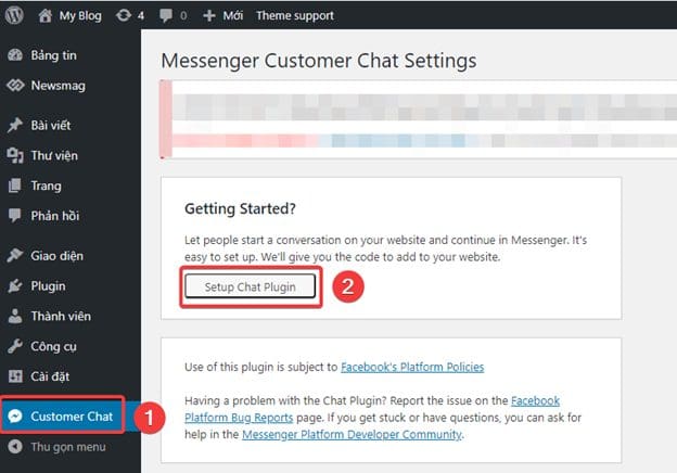 Sau khi Activate thành công, tại giao diện quản trị các bạn truy cập Customer Chat (1) => Setup Chat Plugin (2).