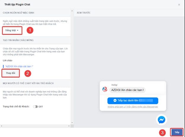 Tại phần thiết lập này, bạn có thể tuỳ chọn Ngôn ngữ (1) , Lời chào (2) => Tiếp (3).