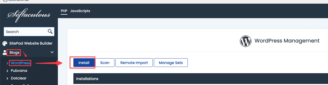 Sau đó bạn Chọn Blogs => WordPress => Install để bắt đầu cài đặt