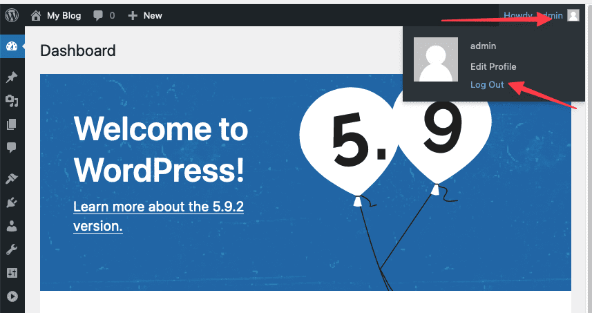Để đăng xuất khỏi trang quản trị WordPress, bạn click vào biểu tượng hồ sơ góc phải trên cùng. Sau đó chọn Log Out để đăng xuất