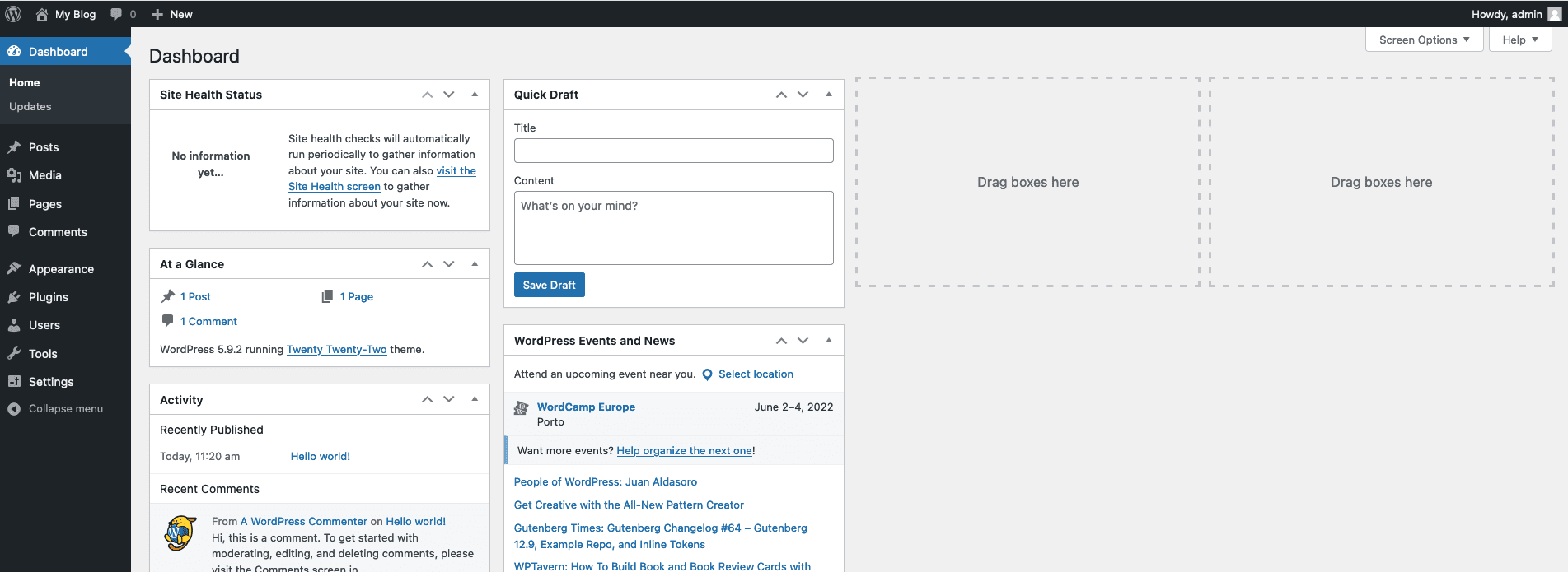 Sau khi bạn đăng nhập, bạn sẽ được chuyển tới bảng điều khiển để quản lý trang web. Tại đây bạn có thể tạo bài viết, danh mục, trang, tag; chỉnh sửa, thay đổi giao diện và cài đặt của trang web