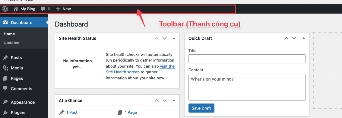 Ở trên cùng màn hình, bạn sẽ thấy một thanh công cụ. Thanh này không thay đổi. Nó sẽ xuất hiện bất cứ khi nào bạn đăng nhập vào admin. Nó chứa tiêu đề trang web của bạn và một số tùy chọn để truy cập nhanh vào chức năng như thêm bài viết, trang, đa phương tiện hoặc hình ảnh mới. Bạn cũng nhìn thấy tên của mình ở góc trên bên phải. Nhấp vào tên của bạn sẽ có các tuỳ chọn như truy cập hồ sơ của bạn và đăng xuất