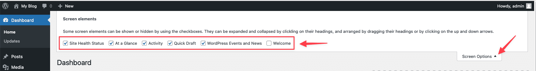 Có hai hộp nhỏ ngay dưới Toolbar. Một cái là Screen Options (Tùy chọn màn hình), cái còn lại là Help (Trợ giúp). Nhấp vào chúng sẽ mở ra menu tuỳ chọn. Bên dưới trường Screen Options (Tùy chọn màn hình), bạn sẽ tìm thấy một số tùy chọn để đặt trang hiện tại của mình. Bạn có thể chọn cửa sổ nào sẽ được hiển thị trên trang