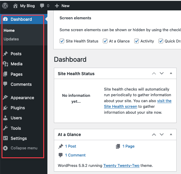 Có một Menu nằm ở bên trái tay trái của trang quản trị WordPress. Ở đây bạn sẽ tìm thấy tất cả các công cụ để chỉnh sửa trang web. Sử dụng con trỏ để điều hướng menu. Khi bạn di chuyển con trỏ đến một trong các công cụ quản trị, bạn sẽ thấy các tùy chọn riêng lẻ của nó. Bạn có thể truy cập các mục menu bằng cách nhấp vào chúng.