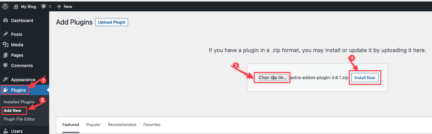 - Plugins: Trong mục này bạn có thể cài đặt, kích hoạt hoặc hủy kích hoạt các plugin của WordPress