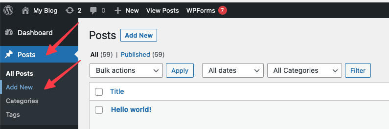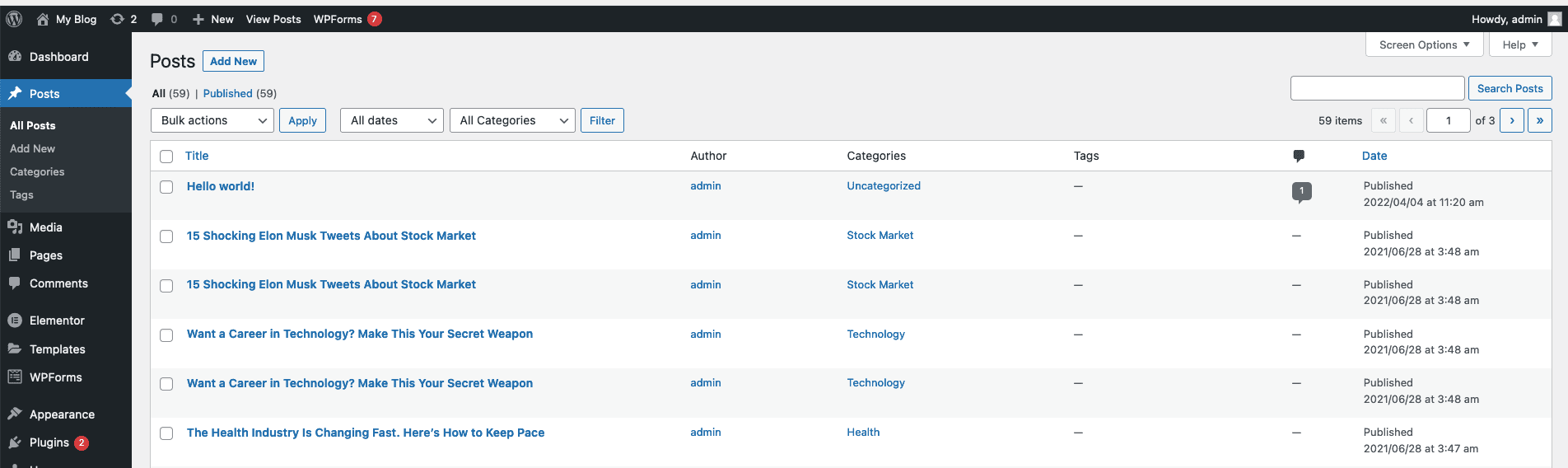 Khi bạn nhấp vào Posts (Bài viết) trong menu WordPress, bạn sẽ thấy danh sách tất cả các bài viết, bao gồm thông tin như tác giả, danh mục, ngày tạo hoặc chỉnh sửa. Phía trên danh sách các bài viết ở đầu trang, bạn sẽ tìm thấy thông tin như số lượng bài viết được xuất bản cũng như số lượng bài viết nháp và trong trong thùng rác. Bạn cũng có thể lọc chúng theo danh mục hoặc ngày đăng