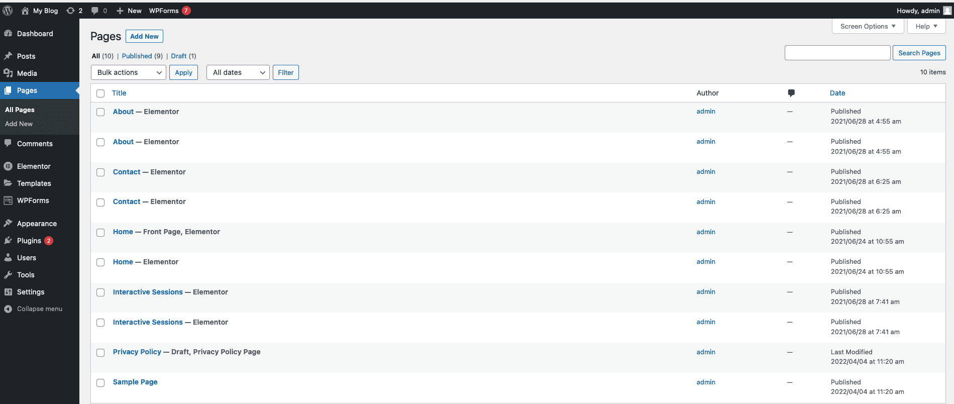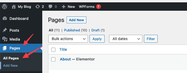 Để xem danh sách các trang, chọn Pages (Trang) trong menu WordPress. Một danh sách các trang của trang web xuất hiện trên màn hình. Trên danh sách, bạn sẽ tìm thấy số lượng tất cả các trang, số lượng trang bạn đã xuất bản, và số lượng bản nháp.