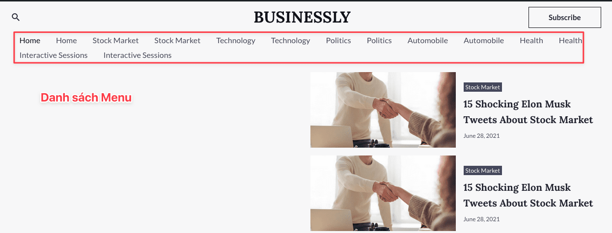 Bên dưới bạn sẽ thấy website với tất cả menu hiện có của mình. Và bây giờ mình sẽ thêm một trang lên thanh Menu này.