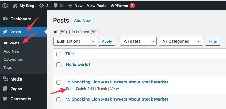 Nếu bạn cần chỉnh sửa một bài viết hoặc một trang hiện có, hãy chuyển đến danh sách tất cả các Bài viết/Trang trong wp-admin. Bấm vào vào tên của Bài viết/Trang bạn muốn chỉnh sửa. Bạn cũng có thể nhấp vào Edit (Chỉnh sửa) xuất hiện dưới tiêu đề của Bài viết/Trang khi bạn di chuyển bằng con chuột vào nó