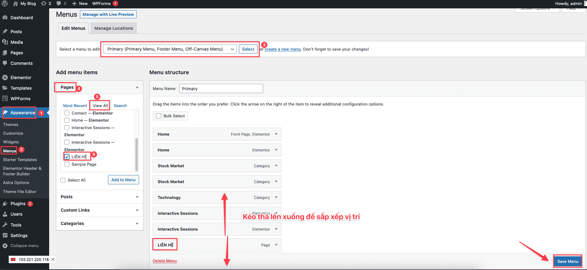Mình sẽ đưa một trang Liên Hệ ra menu, do đó sẽ tick chọn trang này và chọn Add to Menu, chọn vị trí theo thứ tự bằng cách kéo thả và chọn Save Menu để lưu lại.