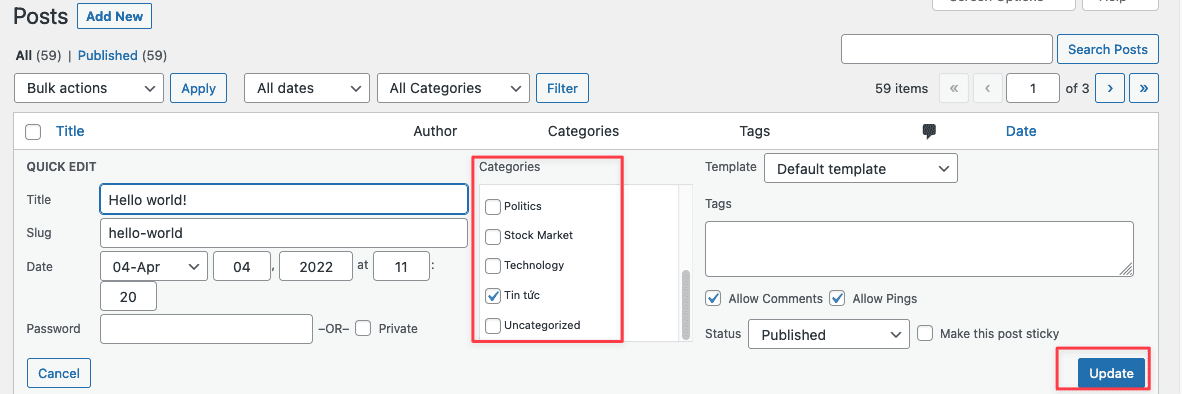 - Quick Edit (Sửa nhanh): Tại đây bạn có thể chỉnh sửa một số thông tin cơ bản về bài viết như Tiêu đề, Slug, Ngày, Tác giả, Cho phép Nhận xét và một số tính năng khác.