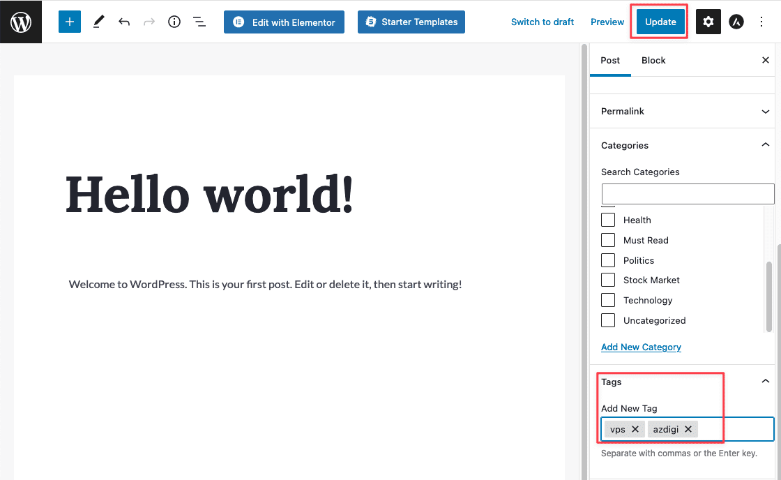 Trong WordPress, bạn có thể thêm thẻ vào bài viết khi bạn tạo hoặc chỉnh sửa nó. Bạn có thể tìm thấy khung để thêm thẻ ở sidebar bên tay phải màn hình