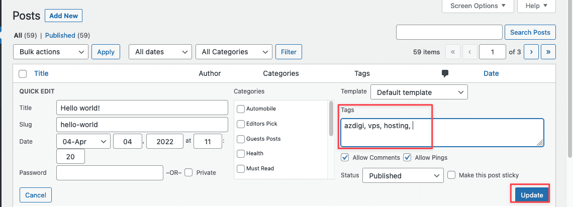 Bạn cũng có thể thêm thẻ nhanh bằng cách di chuột vào tên bài viết và chọn Quick edit (Sửa nhanh)