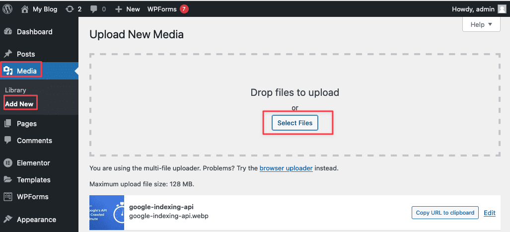 Để tải hình ảnh lên WordPress, trong mục Media (Thư viện) click vào Add new (Tải lên), sau đó bạn chỉ cần kéo thả hình ảnh trên máy tính vào khung upload của WordPress