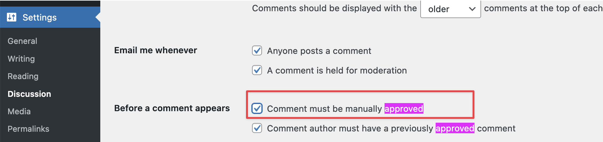Để bật hoặc tắt chức năng kiểm duyệt bình luận các bạn tích chọn hoặc bỏ tích chọn mục Nhận xét phải chờ được kiểm duyệt (Comment must be manually approved)