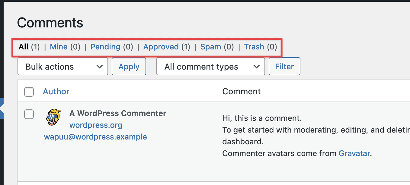 Ở đầu danh sách, bạn sẽ tìm thấy các liên kết để lọc bình luận của khách truy cập. Bạn có thể chọn bình luận hiển thị: Tất cả (All), Mine (Của tôi), Pending (Đang chờ), Approved (Được phê duyệt), Spam, Thùng rác (Trash).