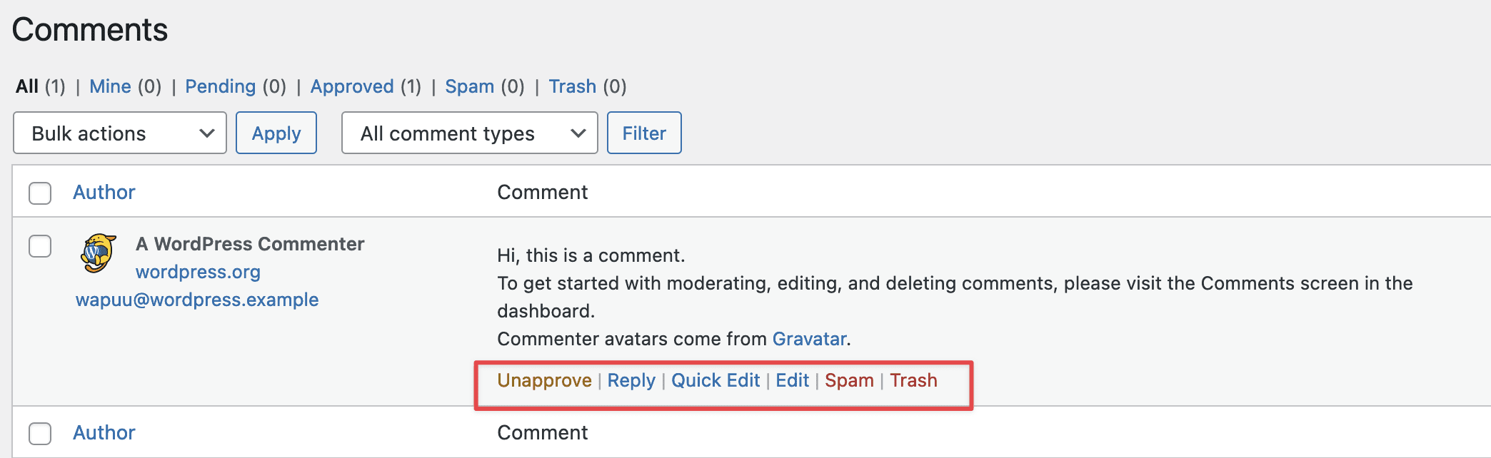 - Unapprove (Phản đối) – tính năng này cho phép bạn từ chối phản hồi của khách truy cập. Bình luận bị từ chối sẽ không được hiển thị.