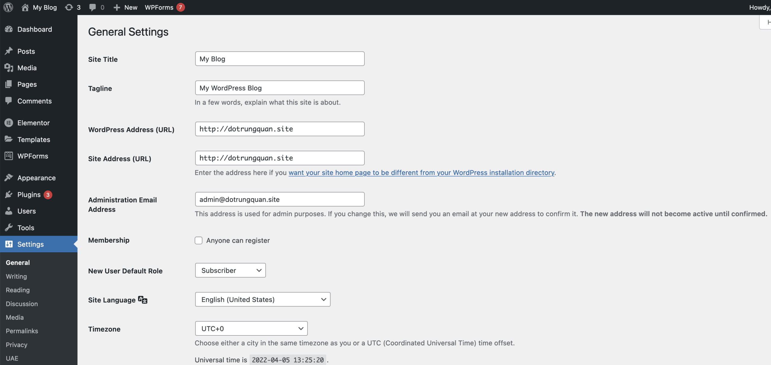 Trong Cài đặt Tổng quan, bạn có thể cài đặt một số thuộc tính trang cơ bản. Điều này bao gồm tiêu đề trang, slogan, địa chỉ URL và địa chỉ email của quản trị viên trang. Ngoài ra, bạn có thể cài đặt ngôn ngữ trang, múi giờ và ngày giờ. Bạn cũng có thể đặt vai trò của người dùng trang web mới. Hãy nhớ bấm Lưu thay đổi (Save changes) ở cuối trang mỗi khi thay đổi cài đặt