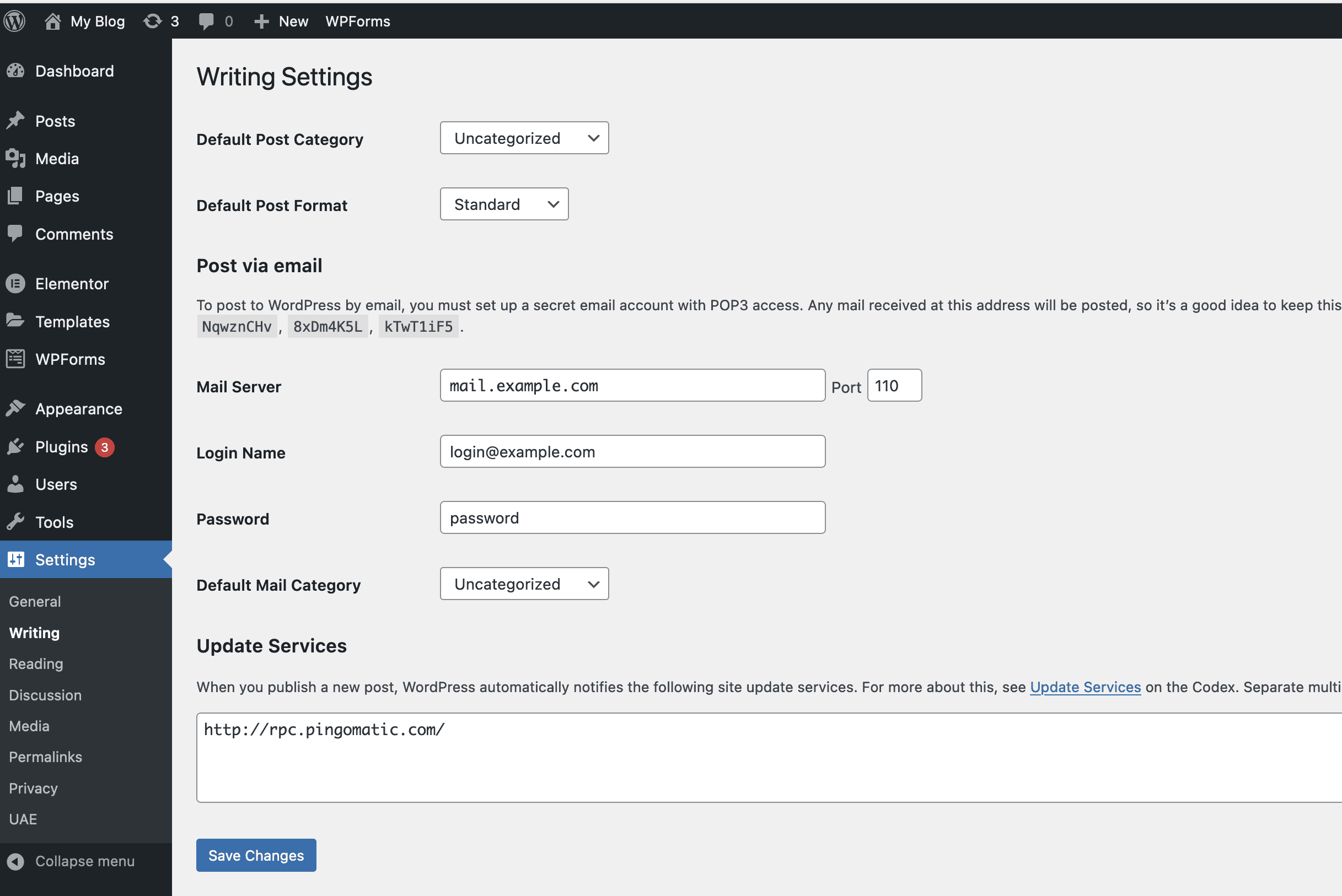 Trong phần này có một số tùy chọn liên quan đến nội dung của trang web. Bạn có thể chọn danh mục và định dạng mặc định cho bài viết hoặc thiết lập xuất bản bài viết qua email. Hãy nhớ bấm Lưu thay đổi (Save changes) ở cuối trang mỗi khi thay đổi cài đặt.