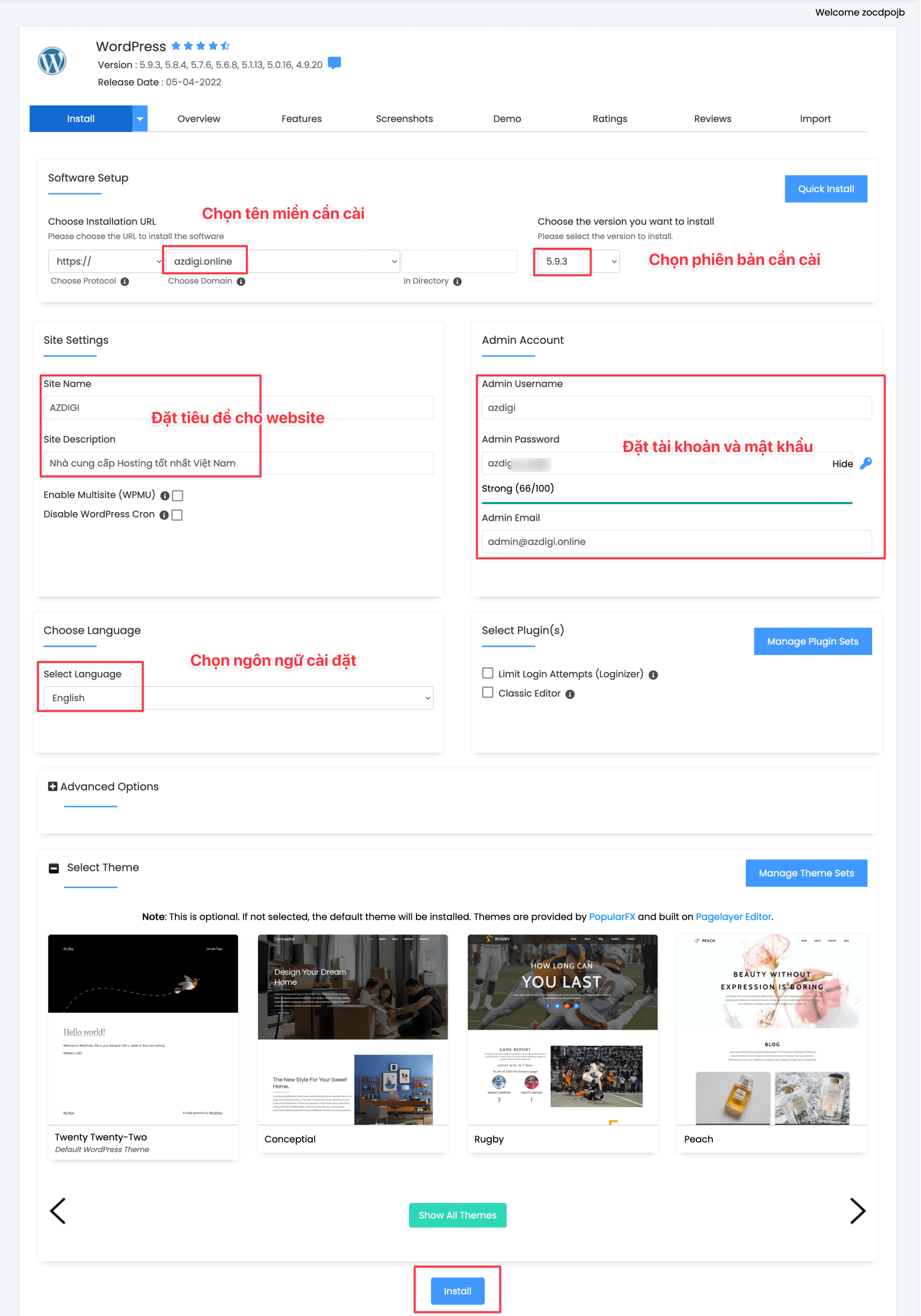 Giao diện cài đặt WordPress xuất hiện. Bạn hãy nhập và chọn các thông tin như ảnh đính kèm để thiết lập:
