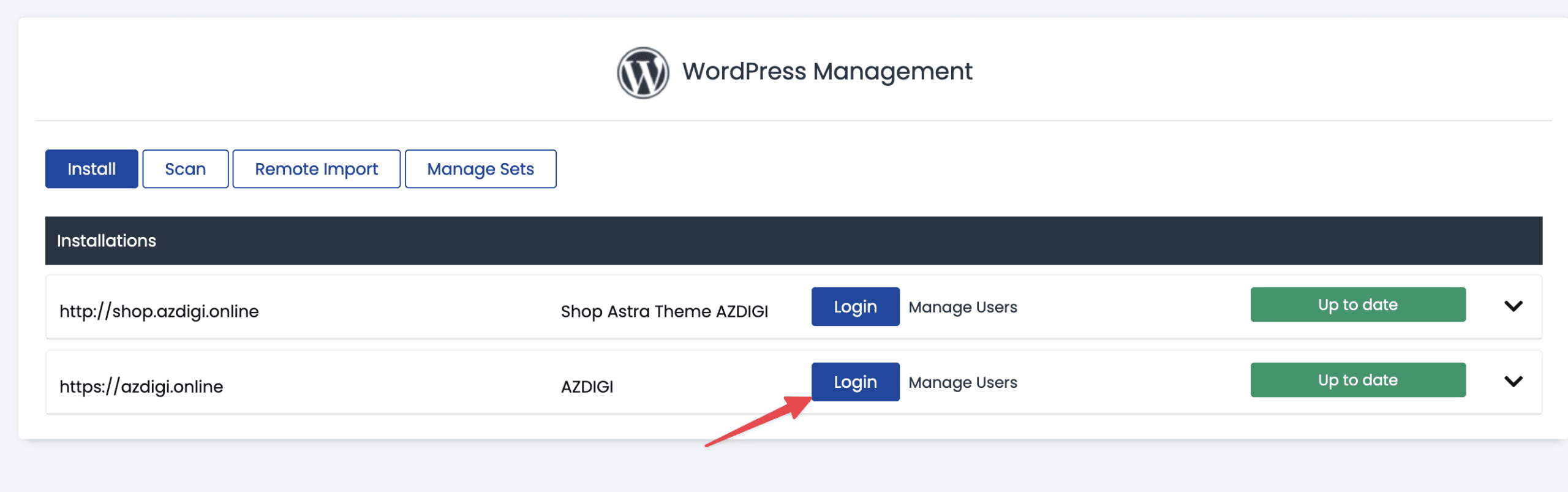 Hệ thống sẽ liệt kê ra các website của bạn, để đăng nhập vào WordPress bạn click vào nút Login để đang nhập trực tiếp.