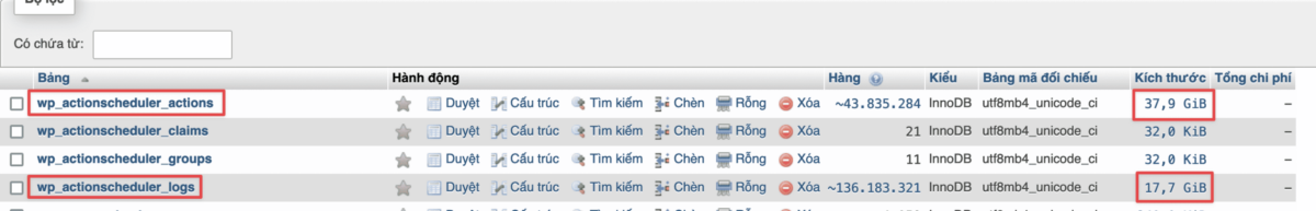 Nếu bạn có sử dụng WooCommerce thì sẽ gặp vài trường hợp table actionscheduler_actions và actionscheduler_logs chiếm quá nhiều dung lượng.