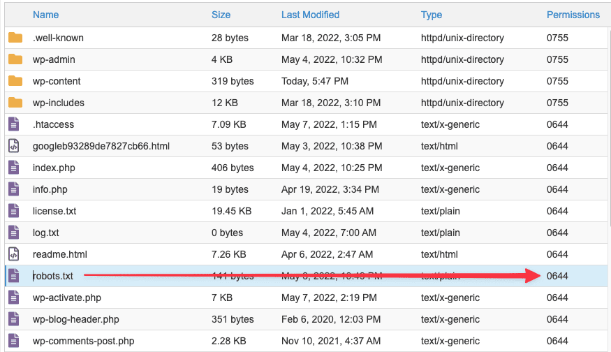 Ở trường hợp này các bạn cần truy cập vào Host/VPS chứa website của mình, tiếp đó tại file robots.txt bạn kiểm tra Permissions của nó xem có đang để đúng 644 không, nếu không đúng bạn cần phân quyền lại cho đúng 644 (như hình dưới).