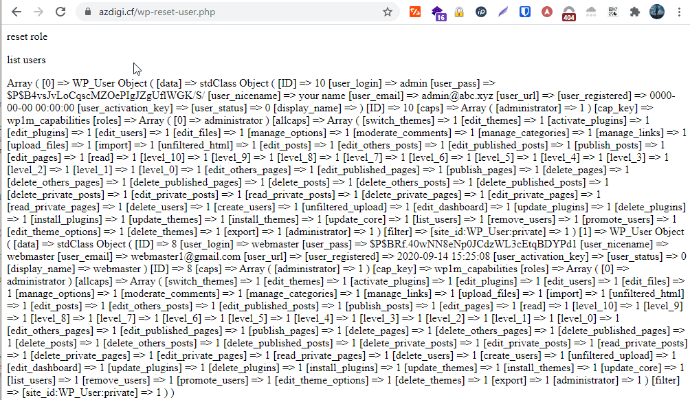 Nếu sau khi thực hiện xong các bước trên mà bạn vẫn chưa đăng nhập được vào quản trị website, thì bạn cần download file wp-reset-user.php này về và upload lên thư mục chứa mã nguồn website. Sau đó bạn truy cập domaincuaban/wp-reset-user.php để website tự động cập nhật lại quyền user. Truy cập ra như hình bên dưới là hoàn tất cập nhật, bây giờ bạn kiểm tra lại xem đã đăng nhập thành công chưa nhé