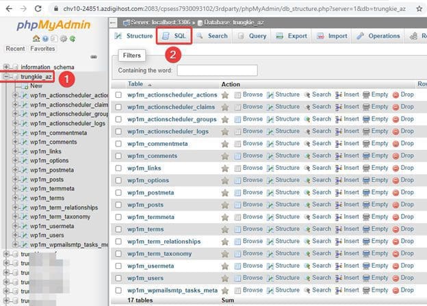 Tại giao diện phpMyadmin, bạn chọn đúng database của website (1) => chọn SQL (2).