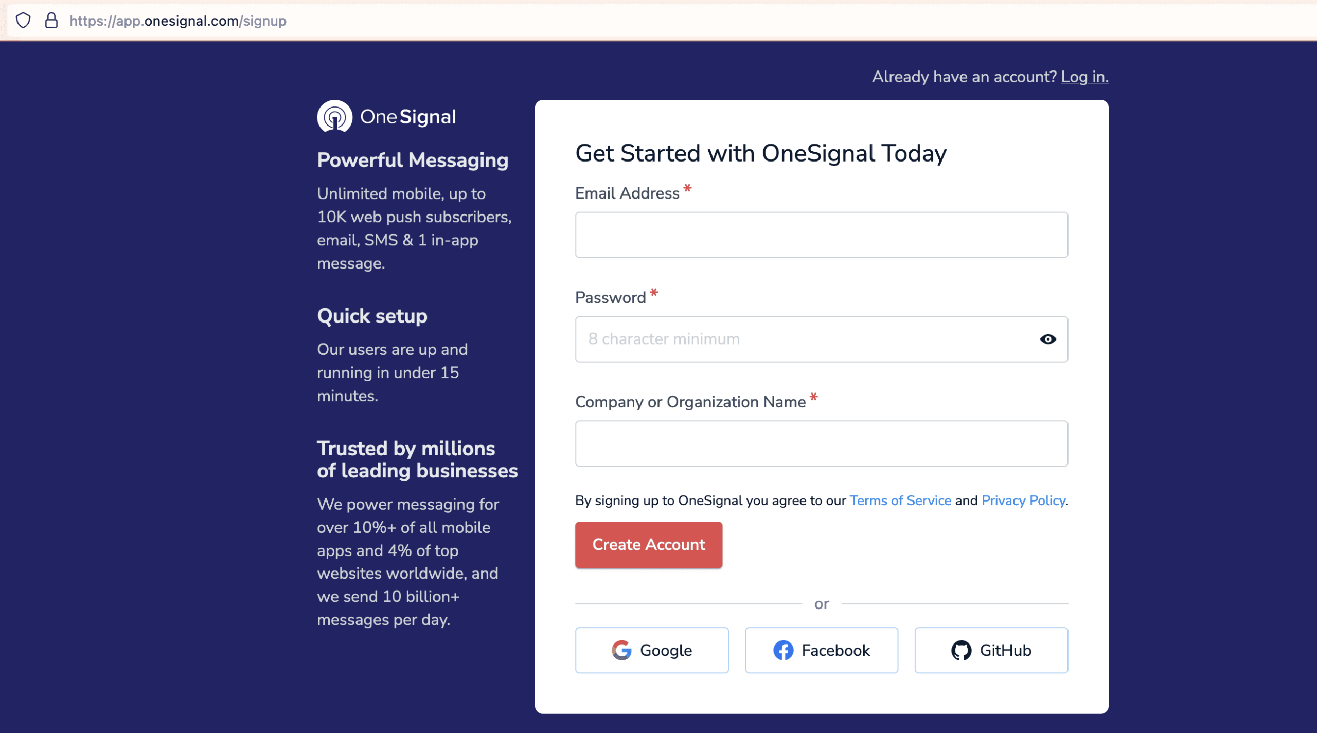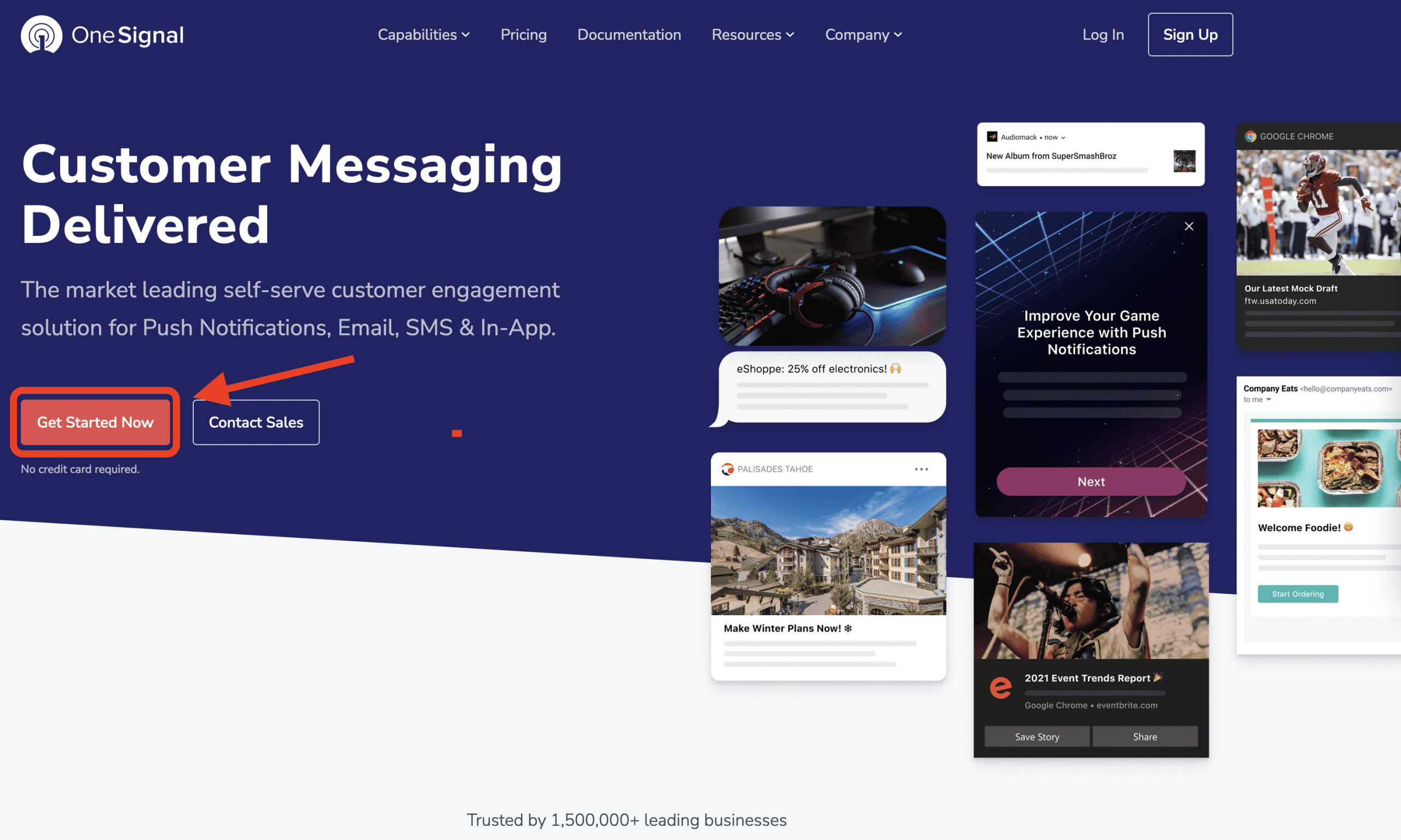 Đầu tiên chúng ta sẽ cần tạo một tài khoản OneSignal miễn phí. Chúng ta sẽ cần truy cập vào trang chủ OneSignal, tại đây chúng ta sẽ chọn nút Get Started Now.