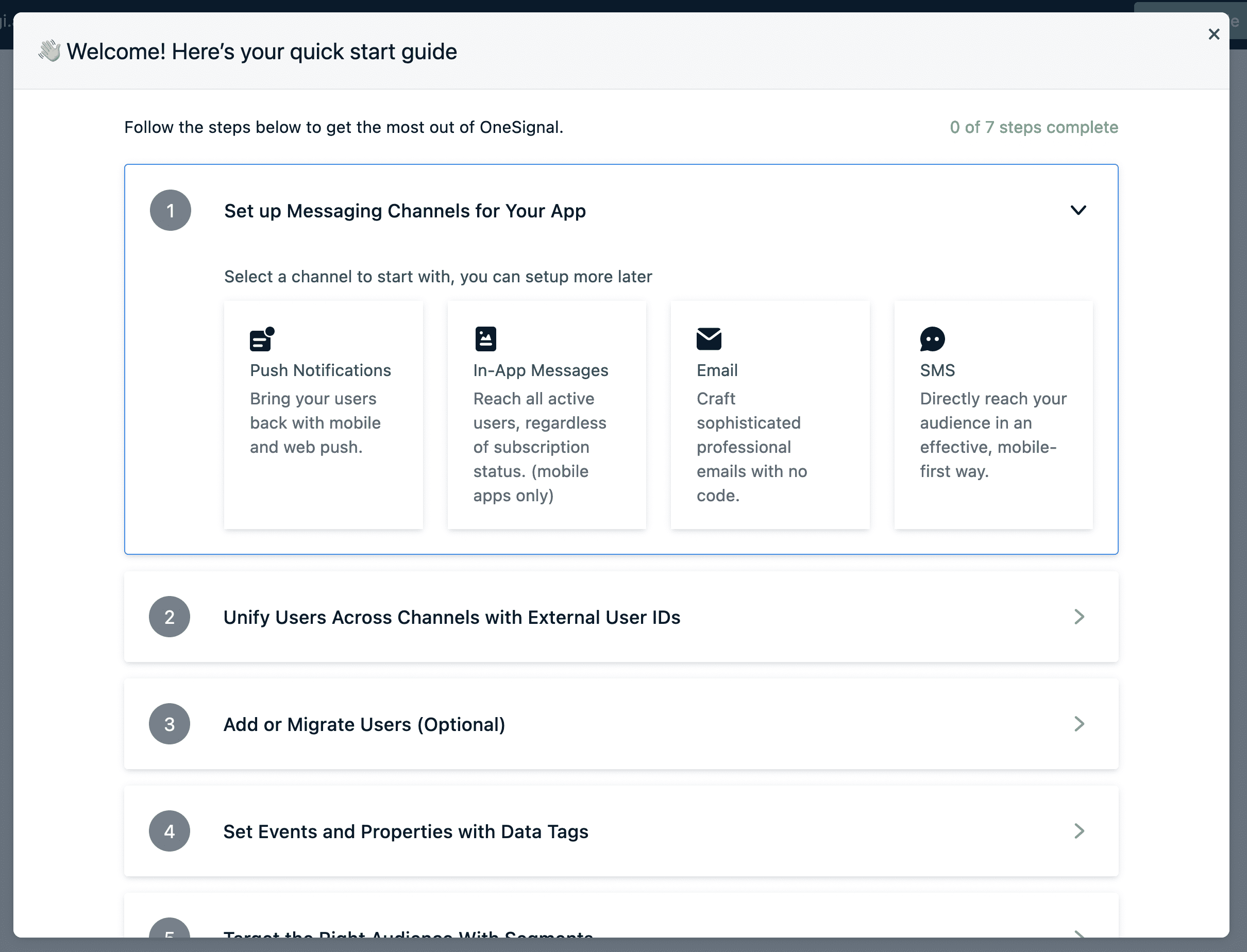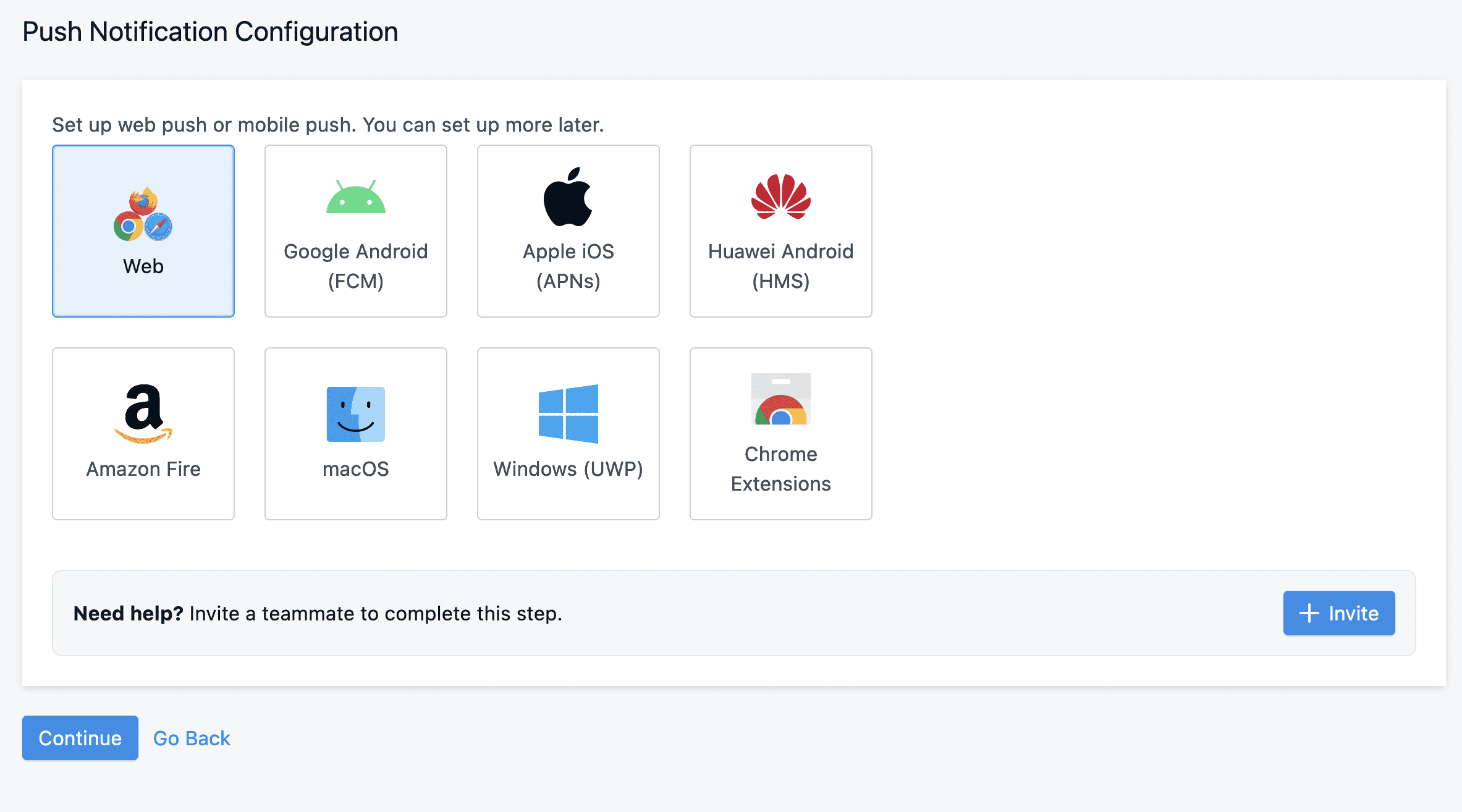 Sau khi chọn gói miễn phí thì chúng ta sẽ bắt đầu sang bước tạo ứng dụng thông báo đẩy. Không chỉ tạo ra thông báo đẩy cho website, OneSignal cũng hỗ trợ tạo thông báo đẩy cho ứng dụng di động và email nếu các bạn muốn tìm hiểu thêm.