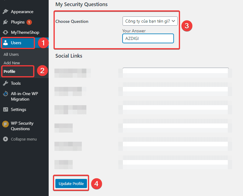 Để áp dụng câu hỏi bảo mật cho người dùng, bạn truy cập Users (1) => Profile (2) =>tại phần My Security Questions (3) bạn điền thông tin như sau: