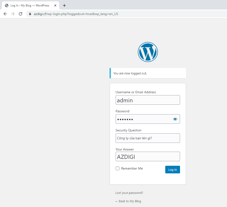 Các bạn truy cập thử vào trang đăng nhập Website của mình để kiểm tra xem đã hiển thị câu hỏi bảo mật chưa nhé. Như hình thì câu hỏi bảo mật đã được hiển thị, các bạn chỉ cần nhập user/pass – câu hỏi/câu trả lời và nhấn Log In là có thể đăng nhập vào trang quản trị.