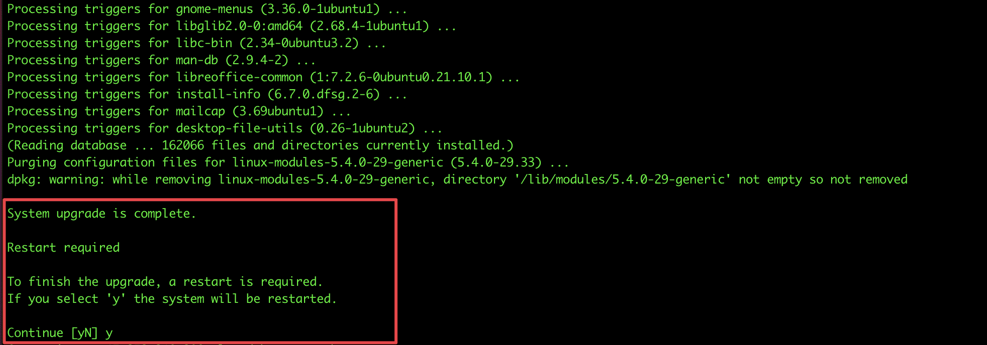 Khi nhận được thông báo System upgrade is complete và hỏi bạn có muốn khởi động lại máy chủ không. Bạn hãy chọn Y để khởi động lại máy chủ