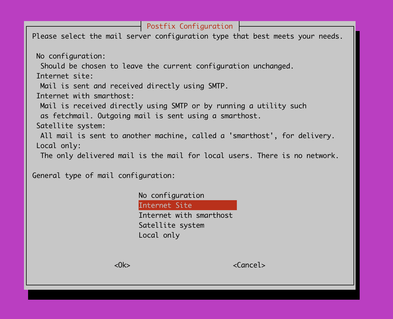 Một thông báo xuất hiện với cấu hình Postfix để gửi thư. Nếu bạn muốn cấu hình thực hiện sau bạn hãy chọn No configuration và chọn Next để tiếp tục.