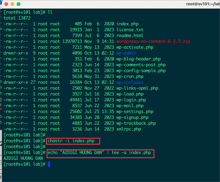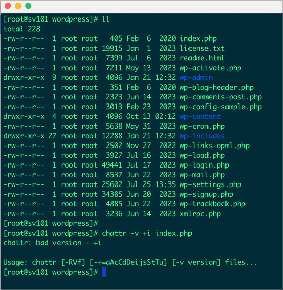 Trong trường hợp này, lệnh chattr -v +i index.php sẽ làm cho tập tin index.php chỉ có thể được đọc, không thể xóa, chỉnh sửa hoặc thay đổi nội dung.