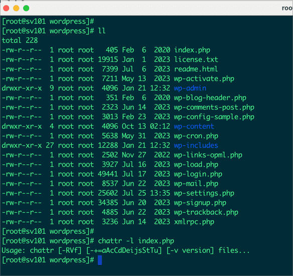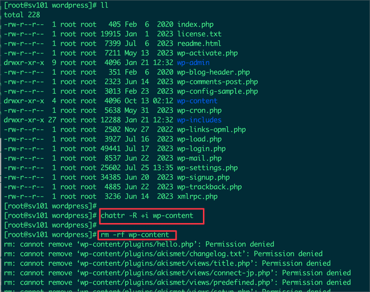 Trong trường hợp này, lệnh chattr -R +i wp-content sẽ làm cho tất cả các tập tin và thư mục con trong thư mục wp-content chỉ có thể được đọc, không thể xóa, chỉnh sửa hoặc thay đổi nội dung.
